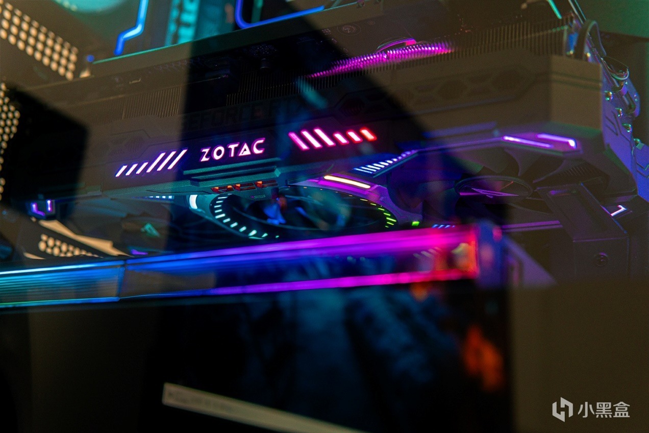 整机配置如上,索泰RTX 4080 SUPER 16G PGF OC占用近4个PCI插槽,还是挺夸张的,其使用了6根冰脉2.0复合热管,配合内部大VC模组和高风压风扇,散热能力不容小觑。