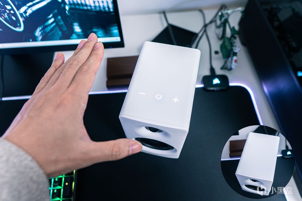 起初刚开箱时,我以为N300为了极致简约,无法按键调控音量,通电后才发现,原来是隐藏式触控,灯光熄灭时,是看不到有触控按键的,当手经过音箱上方10cm左右距离时,触控按键会亮灯。