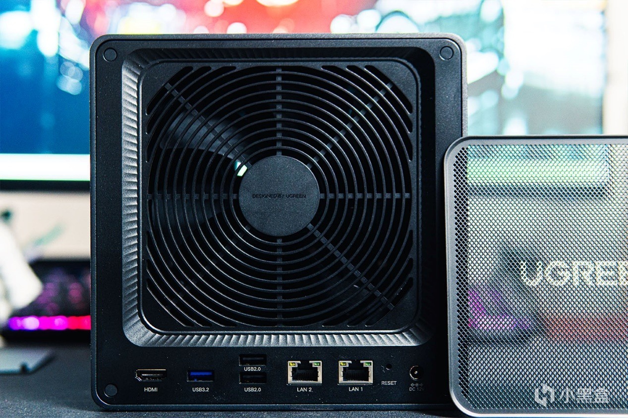 拆下尾部磁吸式防尘网,可以看到14cm大尺寸风扇,其下方有HDMI、USB3.0、USB2.0*2、2.5G网口*2和reset端口。