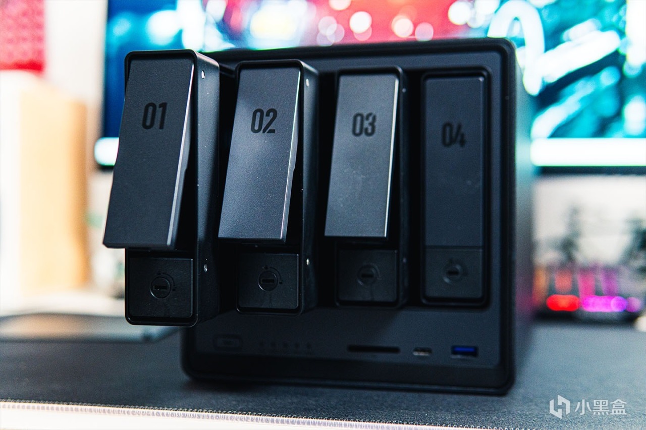 绿联私有云DXP4800外观比较方正,和传统铁皮NAS对比,其3.5mm厚度航空铝金属机身质感拉满,正面可以看到4个硬盘仓都带儿童锁,下方有电源键、网络+硬盘指示灯、SD卡槽、Type C接口和USB3.0接口,对于相机用户来说,SD卡槽使用频率非常高。