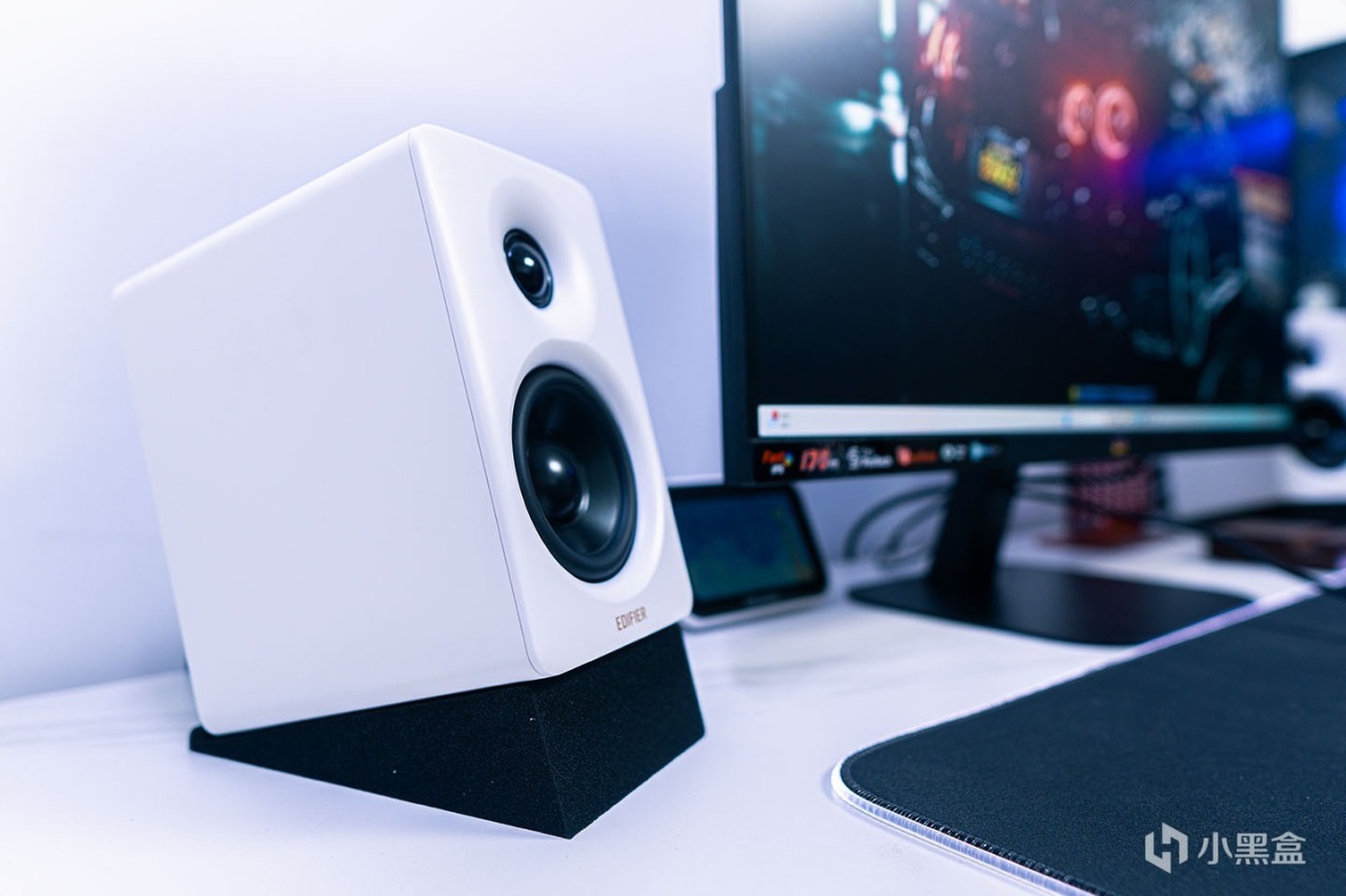 N300小巧体型就非常讨喜了,放在27英寸显示器两侧,显得非常mini,音箱摆放比较自由,朝向可以向内,让声音指向人耳,N300自带的泡沫增高架也非常实用。
